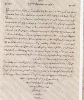 (اقوامی که در دوطرف خط فاصل متوطنند، اینقدر حق دارند که درباب اراضی موروثی وجبال هیمه دار واودیه ومراتع علفزار ، دواب ومواشی خود مذاکره ومکالمه نمایند وعزت مندان مذکورهء فوق که ازطرف این دولت مامورند تصفیهء آنرا خواهند کرد واګر امر بزرګی روی دهد قرار داده شده است که خودم با دولت بهیهء برطانیه ګفت وشنود نموده برامری که امضا شود کارګذاران این دولت را هدایت کنم وهمجنین کارکنان آن دولت را خود او رهنمونی خواهد کرد وآنګاه که رفع مرافعات کوچک ازمیان شده دفع منازعات بروی روز آمد وهرقوم بحد خود راضی وقانع ګشت به امضای أمنای هردو دولت تعین خط فاصل ونصب علایم روی کار خواهد آمد. این بود حقیقت کار تقسیم وتعین حدود بین دولتین که خبرداده شد ودرین باب هرچه ګفته ونوشته شد تغیر وتبدیلی واقع نخواهد شد فقط)