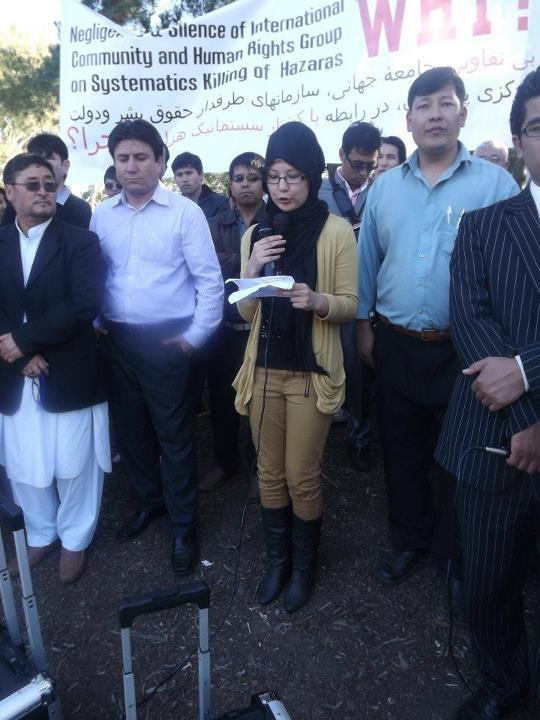 خانم حبیبه روشن محصل در دانشگاه "یوتی اس" به مشکلات جوانان هزاره در وضعیت ناامن پاکستان اشاره نمودند، که در بخش از سخنانش آمده بود" جوانان هزاره در پاکستان قربانی حملات تروریستان و افراط گرایان میگردند. آنها نمی توانند به تحصیلات شان ادامه دهند چون هر لحظه از طرف گروه های تروریستی تهدید می شوند. تروریستان نیز تلاش می کنند تا جوانان ها را بیشتر از بین ببرند. چون از توانمندی جوانان هزاره می ترسند... حال، ما جوانان هزاره های خارج، باید تلاش کنیم که از طریق فشار های بیرونی، دولت پاکستان را وادار به تحفظ هزاره ها نماییم. باید درد آنهای را که چه در پاکستان و چه در افغانستان هستند، احساس کنیم و نگذاریم تا جوانان ما به کام مرگ بروند... از دولت استرالیا می خواهیم تا هر چه عاجل به کمک ما برسد..."