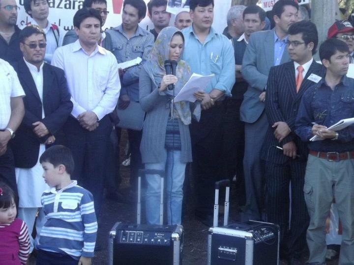 در ادامه، خانم فرزانه اکبر نظری یکی از فعالین اجتماعی هزاره ها گفت " شبکه های تروریستی عامل قتل عام های هزاره ها می باشند و آنها کمر به نابودی ما بسته اند؛ ولی ما هزاره های استرالیا و سراسر جهان باید به اثبات برسانیم که هزاره های پاکستان و افغانستان تنها نیستند ودر هر مرحله باید آنها را حمایت کنیم"؛ ایشان ضمن کمک خواستن از ارگانهای ذیربط بین المللی برای توقف کشتار هزاره ها در شهر کویته، تاکید کرد که نجات ما از رنج کنونی وجلوگیری از اهداف شوم دشمنان انسانیت در برابر جامعۀ ما، فقط در سایۀ همبستگی ماست.