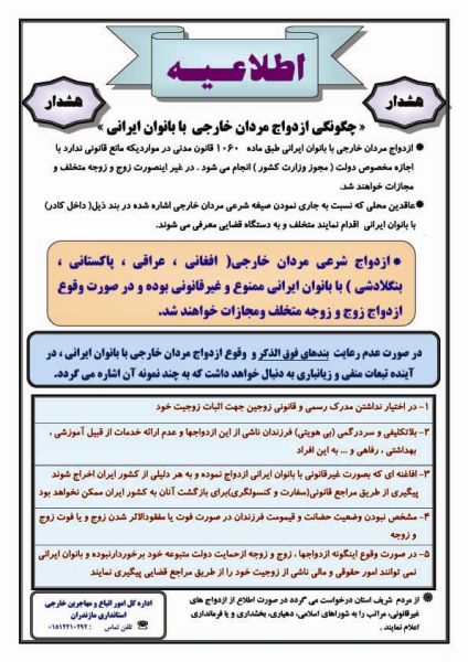 اخیرا استانداری مازندران اعلامیه ای را منتشر کرده که در آن اعلام شده که اگر زنی ایرانی با یکی از اتباع خارجی، بدون اجازه وزارت کشور ازدواج کند، او، همسرش و عاقد مجازات می شود. در حالی که طبق قوانین ایران، درصورت عدم ثبت ازدواج، مجازاتی متوجه زن نمی شود.