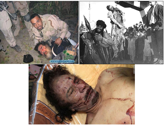 اجساد رؤسای جمهور که قربانیان پلان سرنگونی رژیم شان از طرف غرب بوده اند. از راست به چپ: داکتر نجیب الله رییس جمهور افغانستان، کله از تن جدا شده ی صدام حسین رییس جمهور عراق بعد از اعدام و معمرالقذافی رییس جمهور لیبیا