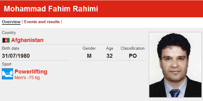 آقای محمد فهیم رحیمی تنها پارالمپیمی افغانستان در لندن می باشد. او 32 سال سن دارد و در وزن 75 کیلو وزنه برداری قدرتی با حریفان خود رقابت خواهد کرد. رقابت او روز سوم سپتامبر آغاز می شود اما هنوز جدول برگزاری مسابقات این وزن در این روز مشخص نیست.