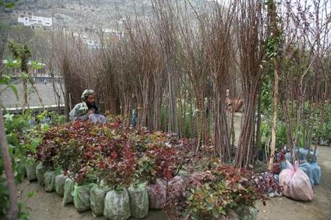 يو بزګر د کابل په پل ارتل سيمه کی نيالګي خرڅوی.