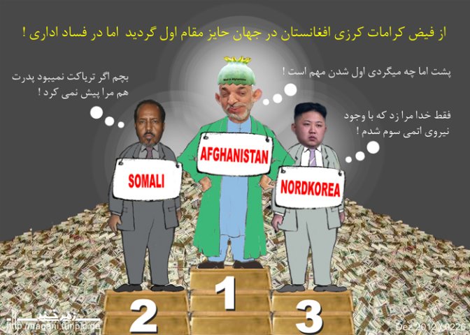 از فیـــــض کـــــرامات حـــــامد کـــــرزی افغـــــانســـــتان در جهـــــان حـــــایز مقـــــام اول شـــــد امـــــا در فســـــاد اداری و چـــــور و چـــــپاول داریی هـــــای عـــــامـــــه !