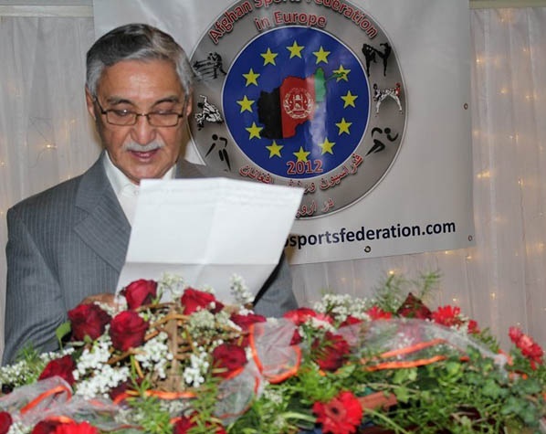 قرائت معرفی نامه مختصر حسین صادقی توسط غلام سخی ارزگانی در محفل اتحادیه ورزشی افغانهای مقیم اروپا در شهر هامبورگ جمهوری فدرالی آلمان