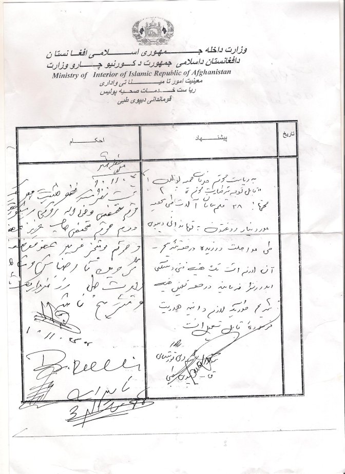 من نیز تعجب میکنم که امضای داکتر قندهار شینواری رئیس شفاخانه در زیر این سند نیست. در حالیکه او بحیث رئیس باید امضا میکرد. اما جالب است که نویسنده فقط همین رئیس را مسوول میداند و با این شش نفر دیگر ( به شمول وزیر داخله) که این سند را امضا کرده اند هیچ اعتراضی ندارد.