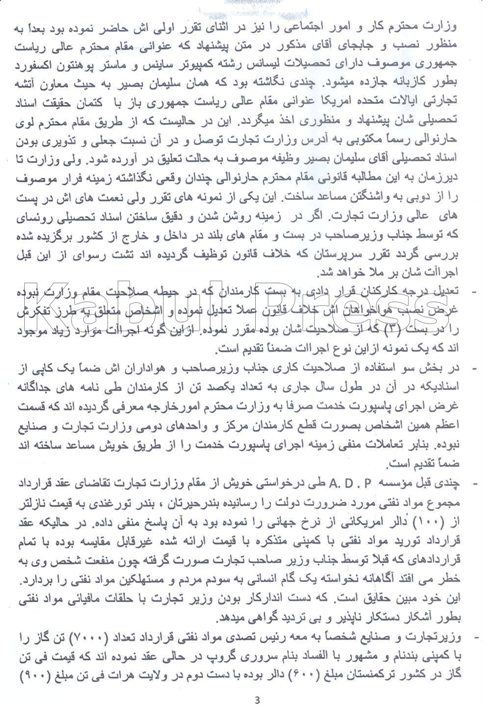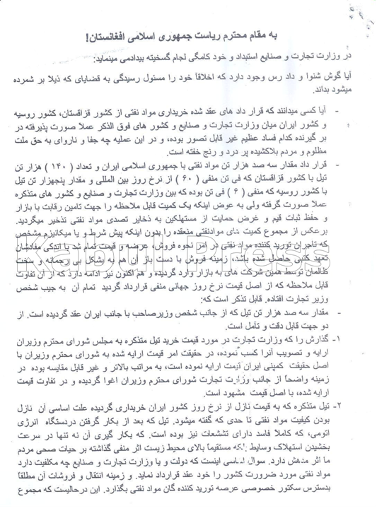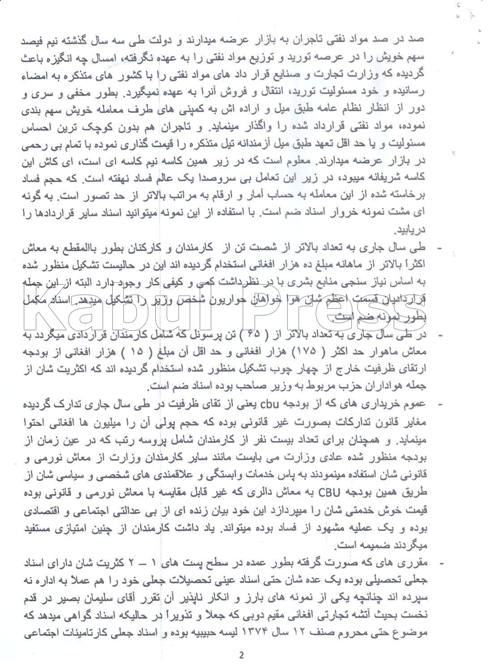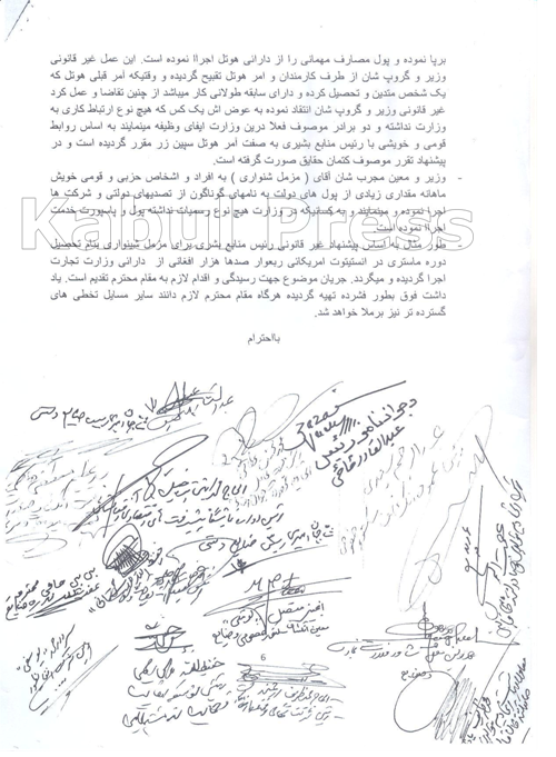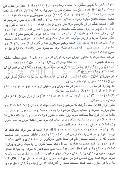 کابل پرس: آنچه را که در ادامه می آيد متن نامه ی برخی از مقامات تجاری افغانستان به حامد کرزی می باشد که پرده از فساد گسترده ی مافیای طالبان نکتایی پوش در وزارت تجارت افغانستان به رهبری انورالحق احدی بر می دارد. از انورالحق احدی تاکنون اسناد زیادی درباره ی اختلاس و چپاول میلیون ها دالر در کابل پرس و رسانه های دیگر به نشر رسیده است. با وجود همه ی این اختلاس های گسترده که او در وزارتخانه های مالیه و تجارت انجام داده، اما همچنان به عنوان یکی از مهره های اصلی مافیا در افغانستان بر قدرت تکیه زده است.