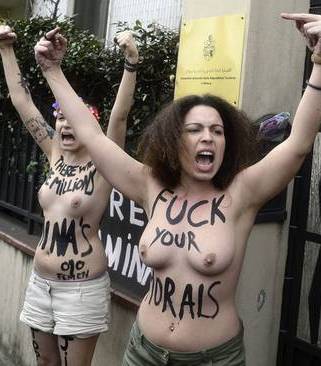 استبداد و زیر پا گذاشتن حقوق انسانی زن ها ، یک تعداد زنها را مجبور به برهنه کردن اندامهایشان به رسم اعتراض نموده است. البته به یقین کامل من با این کار شان موافق نمیباشم اما این زنها به این طریق به ان امام های مفت خوار و مفتی های کثیف و مسلمانان افراطی پیام میدهند که قانون های تو نمیتواند جلو مرا بگیرد. وجود از من و تو برای من قانون میسازی؟ اگر ان مسلمان منحوس افراطی نمیبود ، اینها بدن های خود را امروز به رسم اعترض چرا برهنه میکردند؟