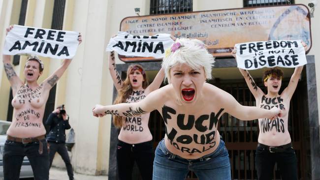 شعارهای را که تظاهر کننده گان جنبش (فیم) بربدبهای لخت خویش حک کرده بودند عبارت بودند از: "ما آزادی امینه را میخواهیم" بدن من مال خودم است" بگا.یم مورال واخلاقت را".