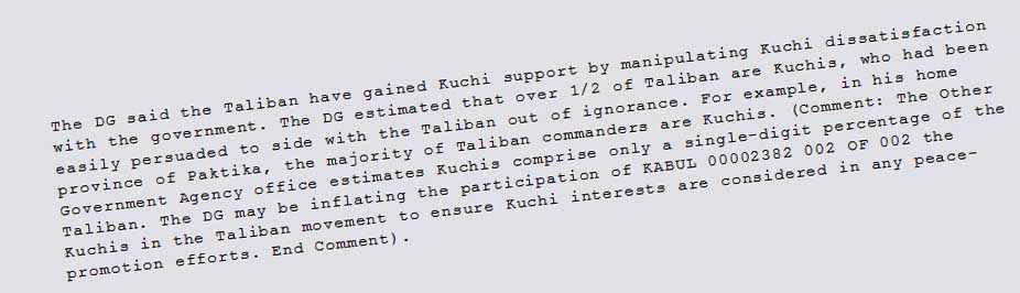 کابل پرس?:سند منتشر شده توسط ویکی لیکس نشان می دهد که سلیمان خیل رییس ریاست عمومی مستقل انسجام امور کوچی ها دو بار در روزهای چهارم و نهم آگوست سال 2009 با مقامات سفارت آمریکا در کابل ملاقات داشته و در آن اذعان داشته که بیشتر از نیمی از طالبان کوچی می باشند. او به مقامات سفارت آمریکا در کابل مثال روشنی آورده و گفته است که برای نمونه در ولایت خود او پکتیکا، بیشتر فرماندهان طالب را کوچی ها تشکیل می دهند.