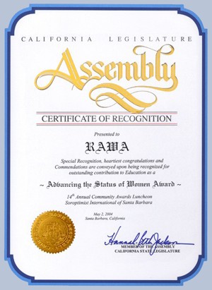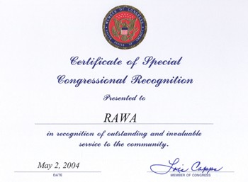 راوا می نویسد که یگانه سازمانی است که در محکومیت حمله آمریکا بر عراق مظاهره کرد. ولی هیچگاه در محکومیت حمله آمریکا بر افغانستان نه تنها که مظاهره نکرد، بل از آن کشور تقدیرنامه دریافت کرد و کتاب خانم سرجاسوس شورای امنیت امریکا را چون افتخاری آویز گردنش ساخت. راوا سیاه سنگ را به خاطر دردنامه عبیرش، سیاه رو خواند و آنرا دلخوشی سیاف و ربانی دانست. آیا مظاهره برای محکومیت حمله بر عراق و سکوت مرگبار و عدم برگزاری مظاهره برای محکومیت حمله آمریکا بر افغانستان، دلخوشی سیاف، ربانی و بویژه آمریکا نبوده است؟