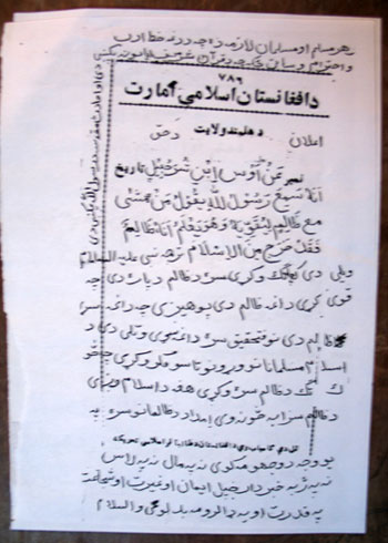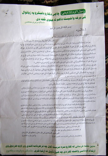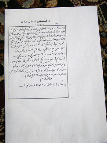 3. به تمام اشخاص به طور جدی اخطار داده می شود که از دادن و افشاء کردن نامهای مبارک مجاهدین به عساکر صلیبی و مزدوران افغان انها طی عملیات ما خودداری کنند، و همینطور به آنهایکه برای آمریکای ها و غلامان افغان آنها جاسوسی می کنند اخطار داده می شود که از این رفتار شیطانی اکیدا صرف نظر کنند وگرنه بدستان مبارک مجاهدین مطابق فرموده های شریعت مجازات خواهد شد.