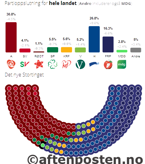 احزاب دست راستی ناروی، این انتخابات را نقطه عطفی در تاریخ سیاسی ناروی دانسته و خود را برای در اختیار گرفتن پارلمان و دولت آماده می کنند. نخست وزیر جدید ناروی به دلیل کرسی های بیشتر احزاب دست راستی، از میان این احزاب انتخاب خواهد شد. آقای ینس استولتنبرگ، نخست وزیر و رهبر حزب کارگر ناروی در واکنش به نتایج این انتخابات گفته است که او رهبری بزرگترین حزب را در پارلمان بر عهده خواهد گرفت. حزب دست راستی هویره هر چند همراه با متحدان بالقوه تعداد بیشتر کرسی های پارلمان را در اختیار دارد اما همچنان خود این حزب، کرسی های کمتری نسبت به حزب رقیب یعنی حزب کارگر دارد.