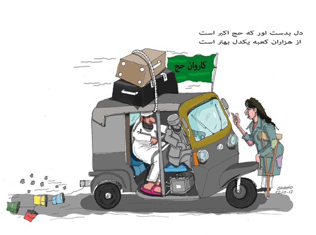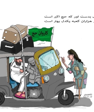شما عالیجنابان یا مسلمان تشریف ندارید یا مسلملن هستید و مانند طالبان از اسلام خبر ندارید. انجام حج یکی از واجبات است که در صورت مستطیع شدن بر هر مسلمانی واجب میشود . یک مسلمان میتواند هم حج برود و هم به همنوعان خود کمک نماید. و شاید شنیده باشید که اعراب ملعون وهابی به اندازه کافی پول نفت دارند برای عیاشی شان و چندان محتاج پول چند نفر حاجی افغانی و پاکستانی و یا............. نیستن که شما عیاشی عربها را به پول حجاج بیت الله ارتباط میدهید نیستند پول حجاج اکثرا به جیب دکانداران و صاحبان هوتلها و رستورانها میرود که یا اکثرا مهاجرین ویا از طبقات نه آنچنان پولدار که بعضی ها فکر میکنند میرود. حال اکربرای شماآهنک احمد ظاهر از فرمان خداوند بیشتر اعتبار دارد شما مختار هستید و آنها که بزیارت حج میروند هم مختار هستند. و این است دمکراسی که روشنفکران تاریک اندیش برایش سینه میزنید و میخواهند که بواسطه دیکتاتوری پرولتاریاآنرا بر مردم بقبولانند.