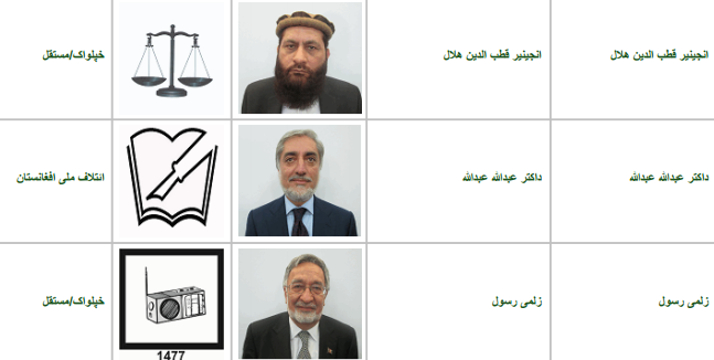 قطب الدین هلال، عبدالله عبدالله، زلمی رسول، عبدالرب رسول سیاف، عبدالرحیم وردک، عبدالقیوم کرزی، محمد اشرف غنی احمدزی، محمد شفیق گل آغا شیرزی، محمد نادر نعیم و هدایت امین ارسلا