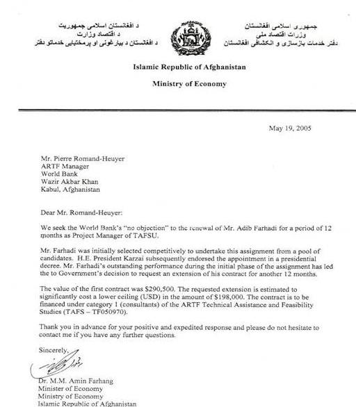 کابل پرس?: سند زير نامه ای با امضای محمد امین فرهنگ وزير سابق اقتصاد و وزير تجارت افغانستان، به یک مقام بانک جهانی در کابل است که نشان دهنده ی دريافت معاش بسيار گزاف 290 هزار و پنجصد دالر آمريکايی در سال توسط اديب فرهادی می باشد. در اين سند از مقام بانک جهانی خواسته شده که ضمن تمديد قرارداد اديب فرهادی، معاش ايشان را برای سال آينده کمتر از سال قبل و به مبلغ 198 هزار دالر آمريکايی در نظر بگيرند.