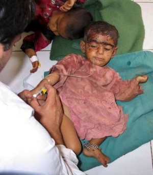 جون 2007، يک کودک که در هلمند در اثر حمله نيروهای بين المللی مجروح شده است/ عکس از رويترز