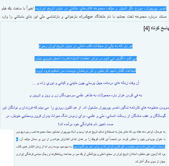 جناب پرویز بهمن گرامی ضمن تشکر از عنایت شما برای من مثل روز روشن است که افرادی همچون انجنیر شیرساپی منعکس کننده اراجیف نویسنده خائن و وطن فروش پور پیرار و سایبری حقوق بگیر وبی منطقی چون کشف وابستگان به جریانهای خا رجی تفرقه افکن پان ترکیسم و پان عربیسم هستند و همواره با نوشتن مطالب کذب و بی پایه و اساس سعی در ایجاد اختلاف میان اقوام مختلف به هدف تجزیه طلبی در محدوده جغرافیایی سر زمین های فارسی زبان می باشند. وظیفه حکم میکند که با روشنگری و دادن اطلاعات درست به خوانندگان گرامی توطئه های این خائنین را خنثی نماییم. با درود