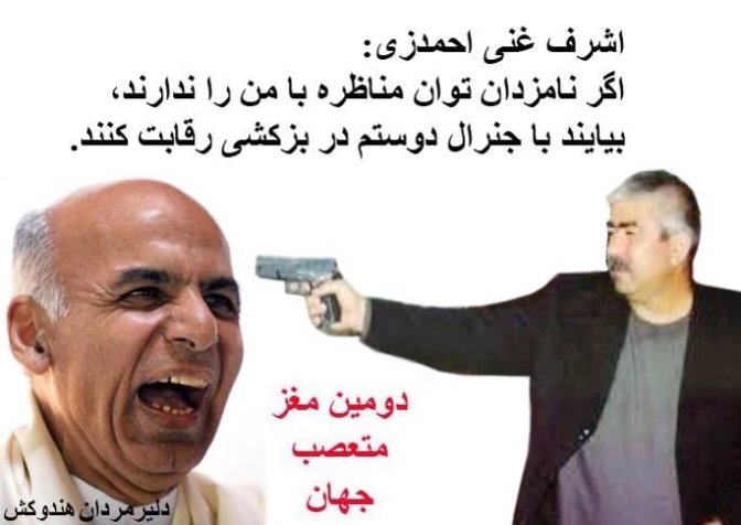 تاسف به حال شما مزدوران ایران و شاگردک های پنجشیری ها، من خود یک فارسی زبان از هرات هستم اما حق را حق میگویم ، مسعود هم همراه با روس ها عکس های بسیار زیاد دارد و پول فراوان هم از روس میگرفت پس کافر شد؟؟؟ اگر استعداد داکتر غنی را هر حرامزاده تان میداشت شاید از او مثل قهرمان ملی تان پیامبر میساختید و داکتر احمدزی که پشتون است قابل تحمل نیست برای تان! افسوس به حال تان ... زهر تعصب وجود تان را تسخیر کرده است.. در باره بهزادک باید گفت که او هیچگاه از هرات نیست و نماینده ما نیست بللکه جاسوس است دوم اینکه وقتی بادی گارد هایش در روز روشن پولیس مظلوم را ضرب و شتم نمود کی صدای خود را کشید..؟؟؟ امیر صاحب اسماعیل خان به سیلی در روی این حرامی زد کجا از ترس در مطبوعات امد؟؟؟ حق حق است ... باید قبول کرد که داکتر احمدزی از همه بیشتر صاحب شهرت نیکو و برنامه و پلان است... بیایید تعصب را کنار گذاشته برایش رای دهیم تا یکبار دیگر اسیر پنجیشری های پنچرمین و قصر نیشن های فعلی نشویم ....بدورد