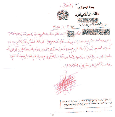 نام حذف شده است/ تو با / محل حذف شده است/ کار می کنی. به تو هشدار داده می شود که کار با آنان را رها کنی در غیر اینصورت دادگاه طالبان تصمیمی درباره تو می گیرد که سرانجام سختی برای تو و خانواده ات خواهد داشت. تو زندگی ات را از دست می دهی.
