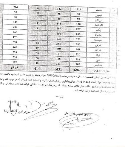 در این سند نشان داده می شود که برای نمونه 484 مرکز رای دهی ولایت ننگرهار، 244 مرکز رای دهی در ننگرهار، 207 مرکز در پکتیا، 266 مرکز در پکتیکا و 175 مرکز در ولایت خوست همه باز خواهند بود و هیچ مشکل امنیتی تشخیص داده نشده است. در عوض در ولایاتی همچون سرپل 32 مرکز، کاپیسا 26 مرکز، پروان 18 مرکز، بادغیس 45 مرکز و غور 50 مرکز به دلیل نا امن خوانده شدن مسدود می باشند. همچنین در ولایاتی همچون دایکندی و بامیان تعداد مراکز رای دهی، با وجود جمعیت بسیار زیاد این ولایات نسبت به ولایاتی همچون پکتیا، پکتیکا و فراه مراکز رای دهی بسیار کم در نظر گرفته شده است.