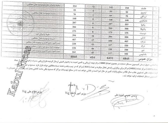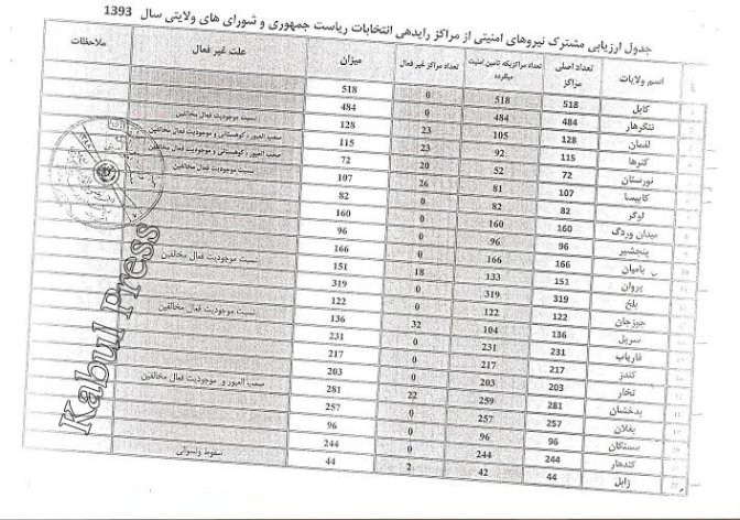 کابل پرس?: در سند بدست آمده توسط کابل پرس که بصورت جدول ارایه شده توسط وزرای داخله، دفاع و رییس امنیت ملی افغانستان درباره مراکز رای دهی می باشد، تمام مراکز رای دهی در ولایات پشتون نشین قندهار، ننگرهار، پکتیا، پکتیکا و خوست در جریان انتخابات سال آینده باز می باشند و در ولایاتی که امنیت در آنجا نسبتن برقرار است و یا مشکل بی امنیتی به اندازه این ولایات وجود ندارد، مراکز انتخاباتی زیادی مسدود خواهند بود و یا مراکز تا جای ممکن کم می باشند.