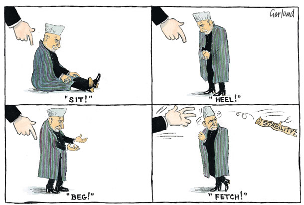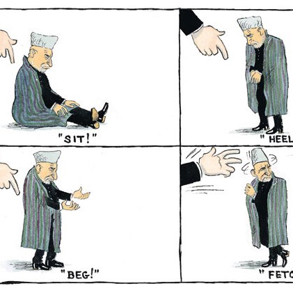 کارتونی از دیلی تلگراف شرح حال کرزی: بشی، کژ شو، گدایی کو، طفره برو