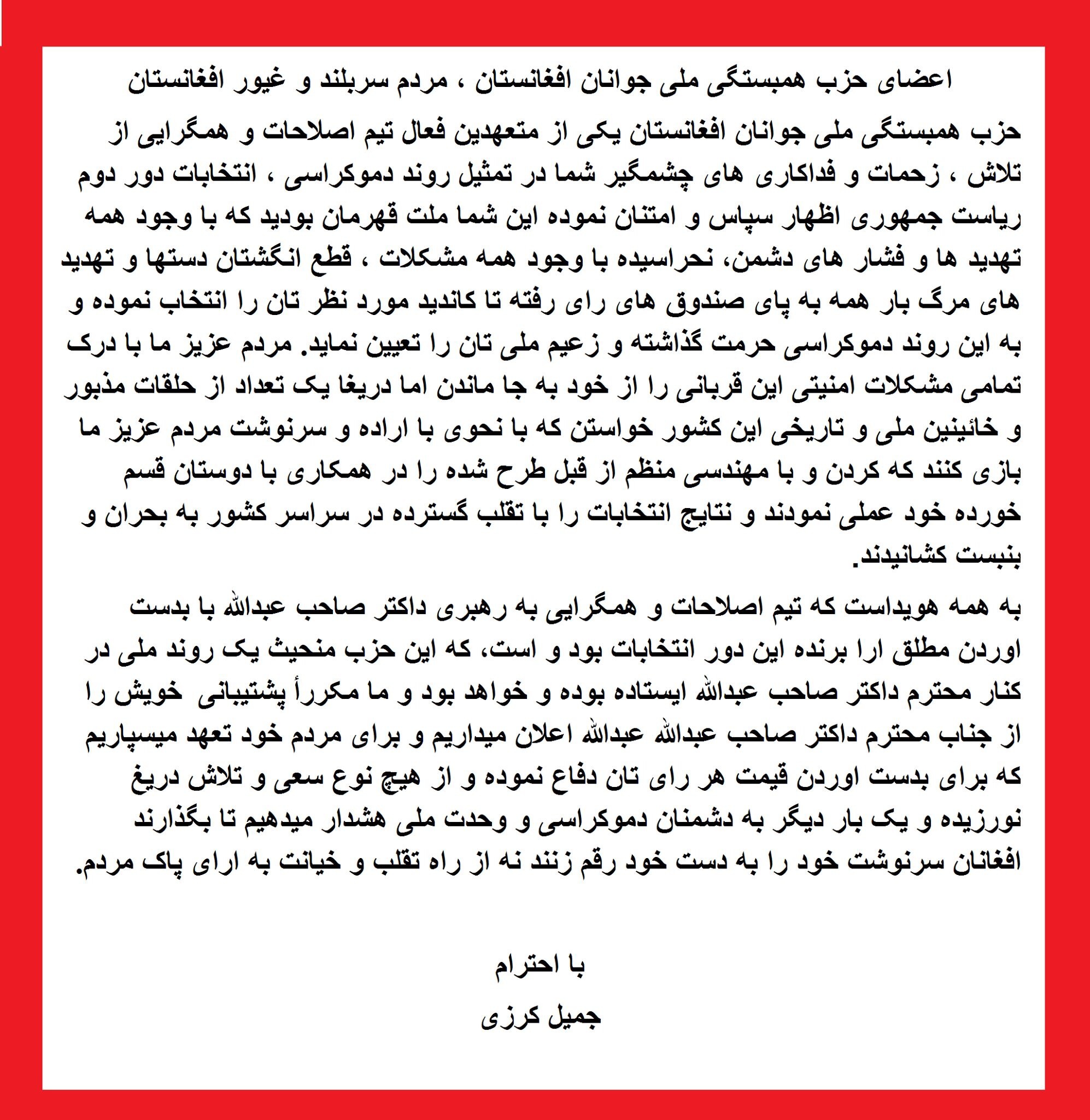 بهترين راهي توقف جريان فعلي مرگ تدريجي براي ملت افغان، عكس العمل عبدالله عبدالله و تيم او است آنهم طوريكه تمامي اعضاي كابينه و واليان دوره حكومت اش را اعلام دارد و با اين عمل نشان دهد برنده انتخابات كشور به اسم افغانستان است. در غير آن ميرويم تا با حكومت ظالمانه اشرف غلي احمق زي بد بخت ترين شويم. پس بدون تاخير از عبدالله بخواهيم اعضاي حكومت اش را هر چه زود تر اعلام دارد.