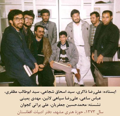طرح جلد کتاب کار علیرضا ذاکری بود که در عکسی که ضمیمه کردهام حضور دارد. در آن زمان ما مهاجران هنوز طراح حرفهای نداشتیم و طراحی کتابهای ما غالباً با ذاکری بود که دوست نزدیک جعفریان بود و از طراحان خوب مشهد. چنان که در قسمت قبل گفتم، «دفتر ادبیات افغانستان» در آن زمان پاتوق ما بود و این عکس هم با جعفریان و چند تن از دوستان شاعر و نویسنده ایرانی در آنجا گرفته شده است.