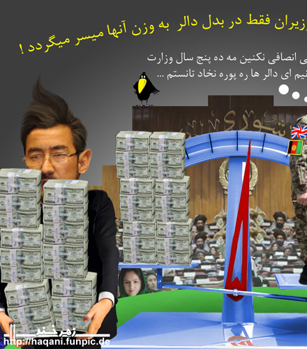 طبعا وزرای محترمیکه با صرف مقادیری هنگفت دالر و خرید رای اعتماد وکیلان به چوکی های وزارت دست می یابند در مدت پنج سال حکومت شان در قدم اول به فکر جبران مصارف شان شده و شب و روز در تلاش خواهند بود تا بعد از جبران دالر های مصرف شده غم فردای فرزندان شان را خورده و در دوبی و کشور های اروپایی برای نور چشمی ها منازل و ویلا های رویایی بسازند.