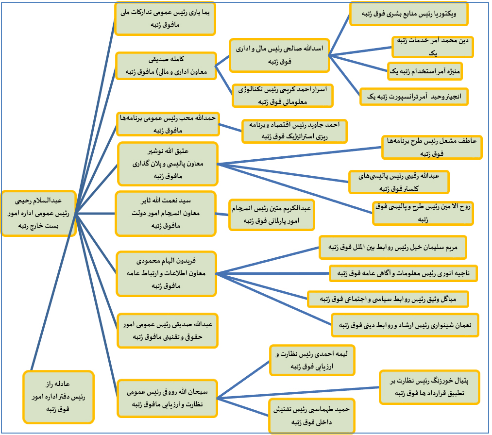 1. اگر قبول کنیم که آقای عتیق الله نو شیر معاون پالیسی و پلان گذاری در بست مافوق رتبه سه ریاست فوق رتبه آقایون روح الا مین رئیس طرح و پالیسی و عبدالله رقیبی رئیس پالیسی های کلستر و احمد جاوید رئیس اقتصاد و برنامه ریزی استراتژیک را تحت اثر خویش داشته باشد، و آقای حمدالله محب رئیس عمومی برنامه ها در بست مافوق رتبه که معادل بست معاونت متذکره است یک ریاست طرح برنامه ها به ریاست عاطف مشعل در بست فوق رتبه را تحت کنترل خویش داشته باشد، اولاً این تشکیل غیر تخنیکی است، زیرا عناوین مترادف آن بیانگر نواقص ذیل در ساختار است؛
