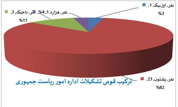 2. اگر به ترکیب قومی انتصاب های اداره امور در گراف مقابل مراجعه کنیم، در می یابیم که شعار یک افغان از یک افغان برتر نیست و نه یک افغان از یک افغان کمتر، در حقیقت به برتری افغان های خاصی نسبت به دیگر افغانها در مفهوم که رئیس جمهور غنی آن را مطرح می کند، شده است. این یعنی اینکه این کشور هیچ گاهی نباید صاحب حکومت ملی و کارا شود.