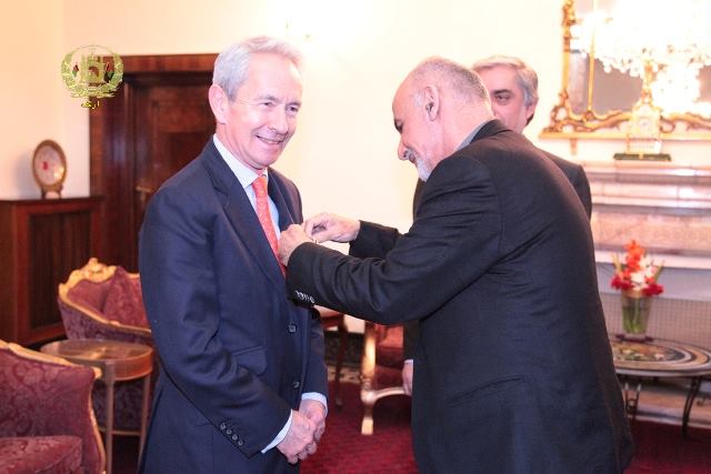 حکومت دست نشانده: ملا اشرف غنی احمدزی و عبدالله عبدالله در حال دادن مدال به سفیر بریتانیا