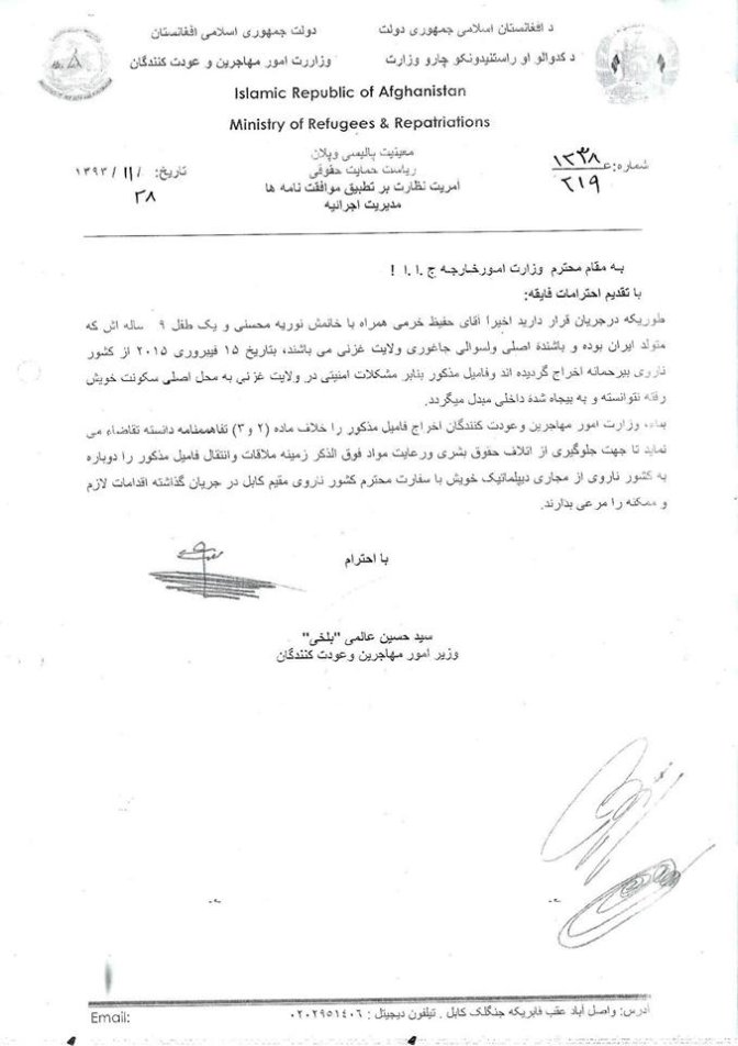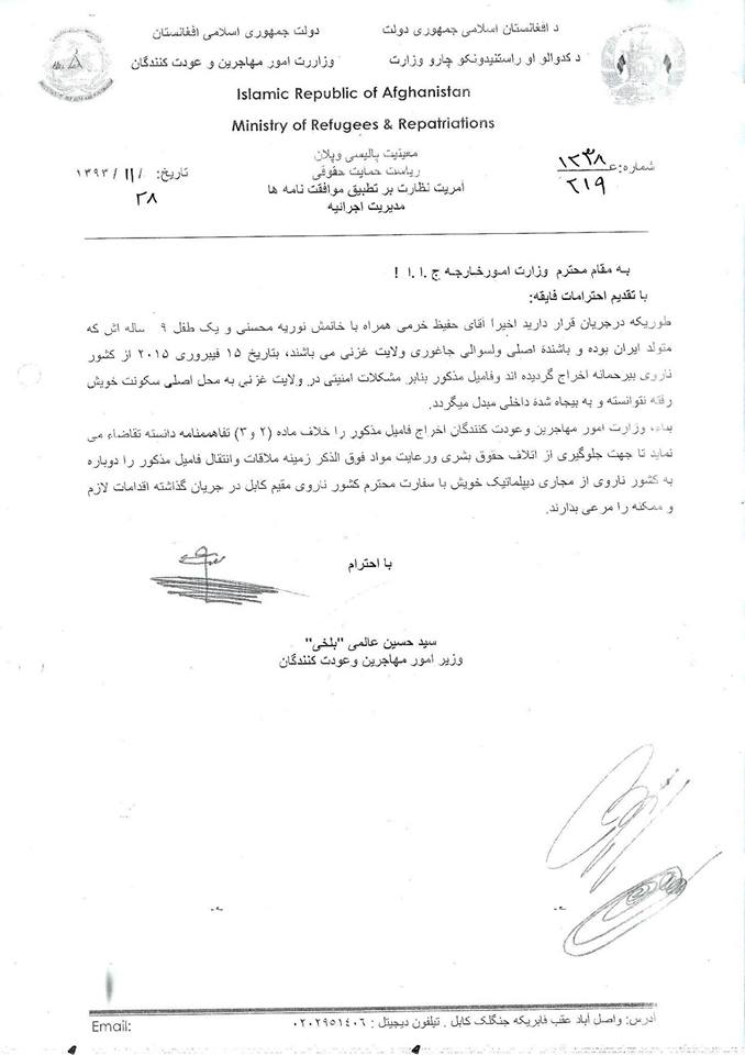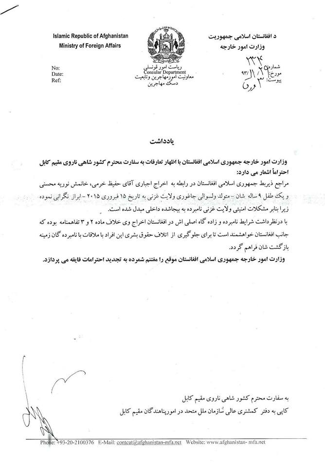 من دو نامه از وزارت امور مهاجرین و وزارت خارجه افغانستان دارم که به تاریخ های 17 و 18 فبروری در مورد یکی از فامیل های دپورت شده عنوانی سفارت ناروی در کابل نوشته شده اند. اما نامه ای را که وزیر امور مهاجرین در مورد توقف کامل دیپورت پناهجویان از آن در مصاحبه خود یاد کرد تا هنوز در هیچ جایی به نشر نرسیده و خود وزیر می گوید که نامه را فرستاده اما نمی داند تا هنوز به کشورهای متبوع رسیده یا نه.