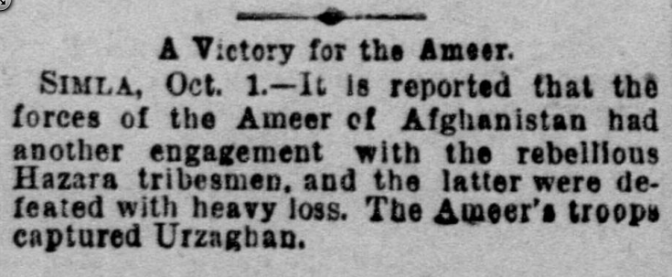 ارزگان یکی از ولایات مرکزی افغانستان فعلی می باشد که در دهه ی آخر قرن 19 میلادی در زمان عبدالرحمان، پس از ژنوسایدی بزرگ، به اشغال افغان ها و یا پشتون های هندی درآمد. طبق اخبار منتشر شده در رسانه های آن وقت، عبدالرحمان ده ها هزار تن از افغان ها را در جنگ با مردم هزاره برای کشتار و تصرف زمین هایشان بسیج کرده بود و پس از چند بار شکست سنگین، در 1892 این منطقه را اشغال نمود و طی احکام حکومتی زمین های زیادی را به سربازان خود و کوچی ها بخشید.
