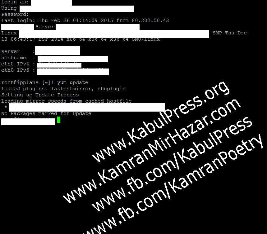 Back to yum, loaded plugins: fastestmirror, rhnplugin, Afghan cyber terrorists say: “Secret Files from #Kabulpress Will be Leaked Soon”. That is very interesting. I have a full backup on my local computer. Just come! I am a poet, a journalist and someone who likes PuTTy.