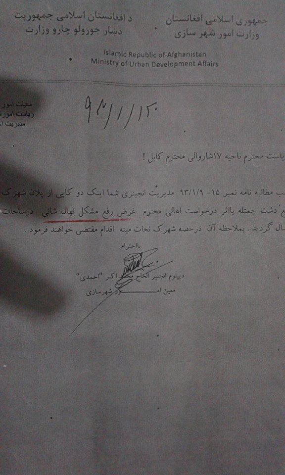این در حالیست که تعهد نامه این بزرگوار در وزارت شهرسازی و مسکن موجود است؛ بر اساس آن آبرسانی، کانالیزاسیون، برق، سرک سازی، اسفالت سرکها، ساختمان جویچه ها، کانکریت پل و پلچکها، احداث پارکها، ساحات بازی اطفال، اعمار مسجد، کودکستان و مکتب همه ی اینها بدوش مالک شهرک میباشد حالا نه تنها از هیچ کدام اینها خبری نیست حتی که غصب و چور شدوع شده است