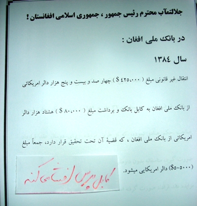 انتقال غير قانونی مبلغ 425000 هزار دالر آمريکايی ، از بانک ملی افغان به کابل بانک و برداشت مبلغ 80 هزار دالر آمريکايی از بانک ملی افغان که قضيه آن تحت تحقيق قرار دارد، جمعا مبلغ 505 هزار دالر آمريکايی می شود.