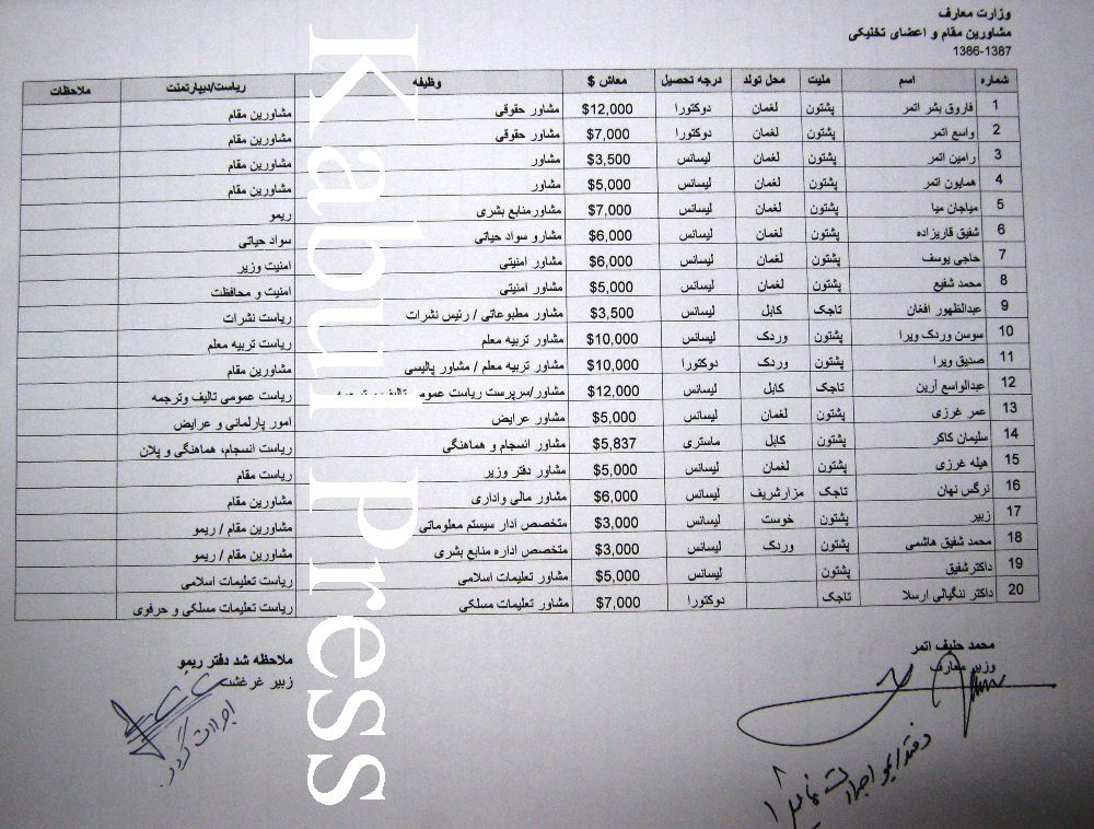 کابل پرس?: سوء استفاده از امکانات دولتی؛ اختلاس؛ پیشبرد پروژه ی سرکوب گروه های قومی غیر پشتون در بغلان و ولایات دیگر؛ تشکیل مافیای درون حکومتی و گسترانیدن جنگ به شمال و جابجایی پشتون های وزیرستانی در این مناطق بخشی از موافقت دوجانبه ی حنیف اتمر و ظهور رزمجو می باشد. هر دو از لغمان می باشند و هر دو غلجایی های سرسخت و هر دو بصورت مستقیم به شبکه های استخباراتی وصل می باشند.