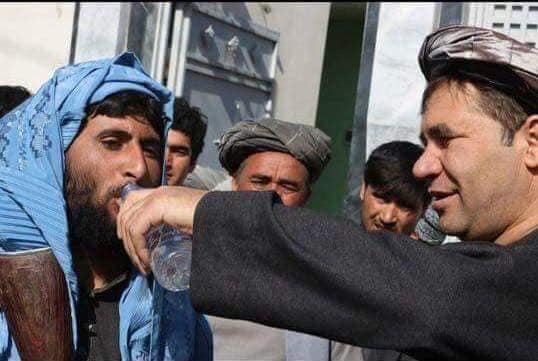 نظام الدین قیصاری فرمانده ی اوزبیک تبار، به یکی از پشتون های طالب چادری پوش که گرفتار شده آب می دهد. این عکس مربوط به ماه مارچ سال 2018 می باشد.