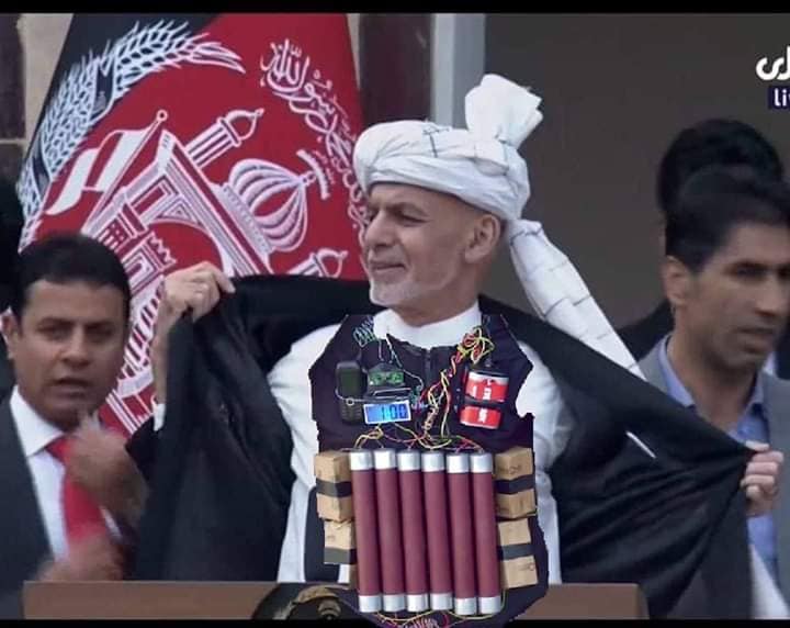 After yesterday’s Kabul circus, many people in social media reacted to Ghani Ahmadzai’s body action by posting a photoshopped picture comparing him to a Taliban suicide-bomber.