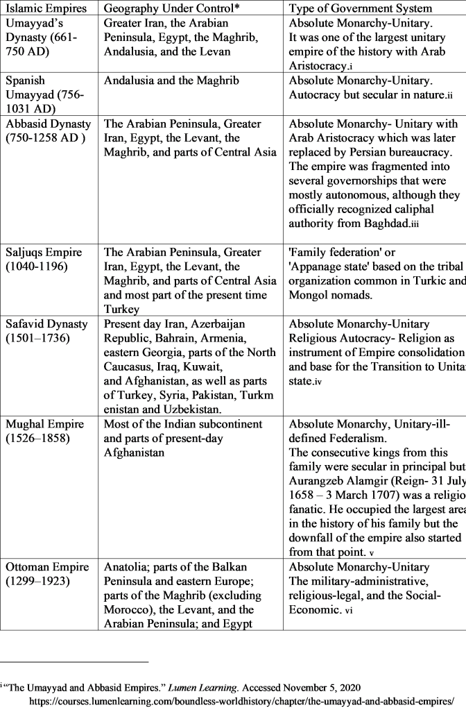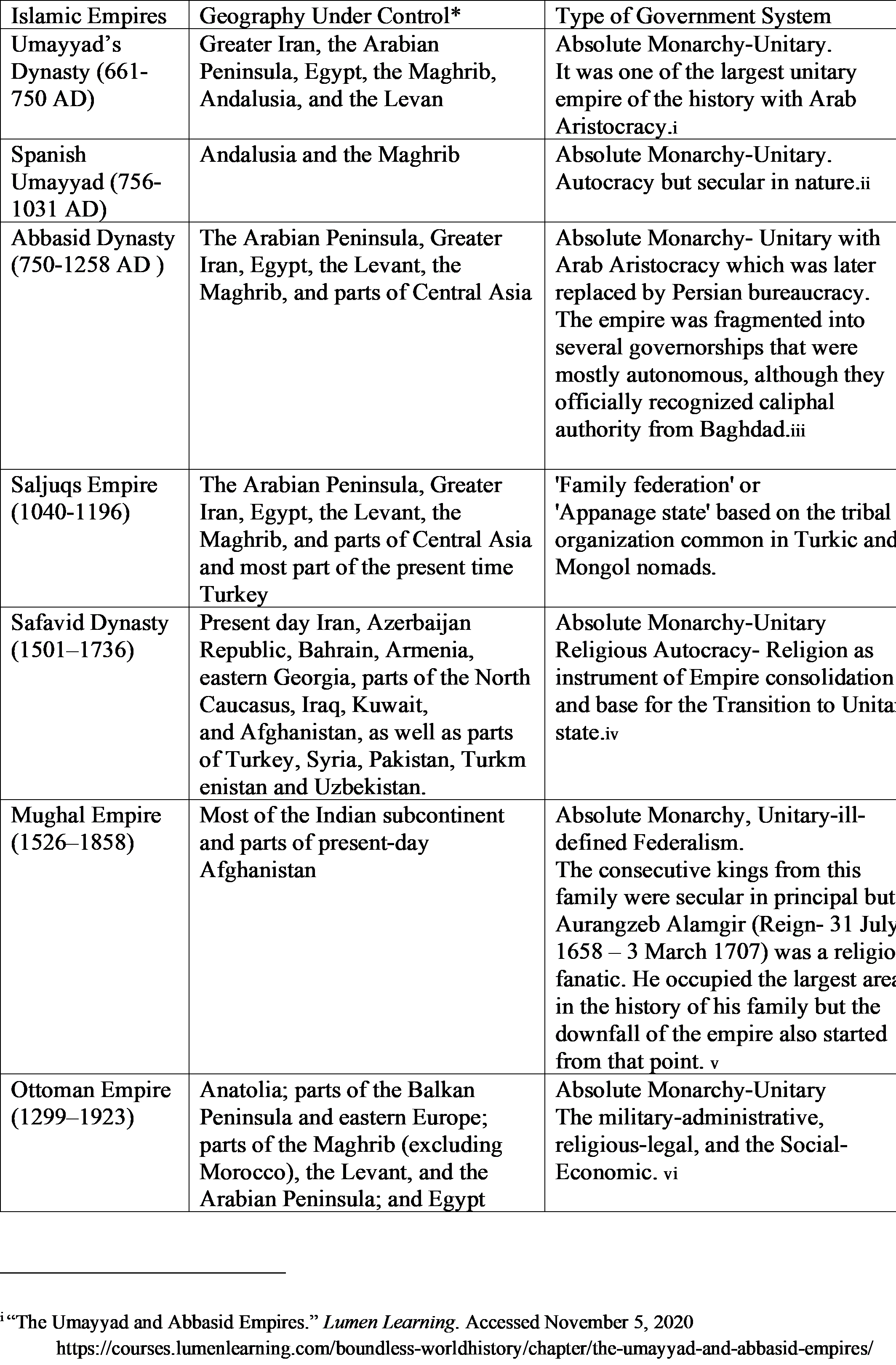 The historical Islamic Empires were almost autocratic, Absolute Monarchies, Unitary in Nature and dominated by clan Aristocracy. The Shriah Law was nothing but an instrument to justify the kingships. (See Appendix 1)