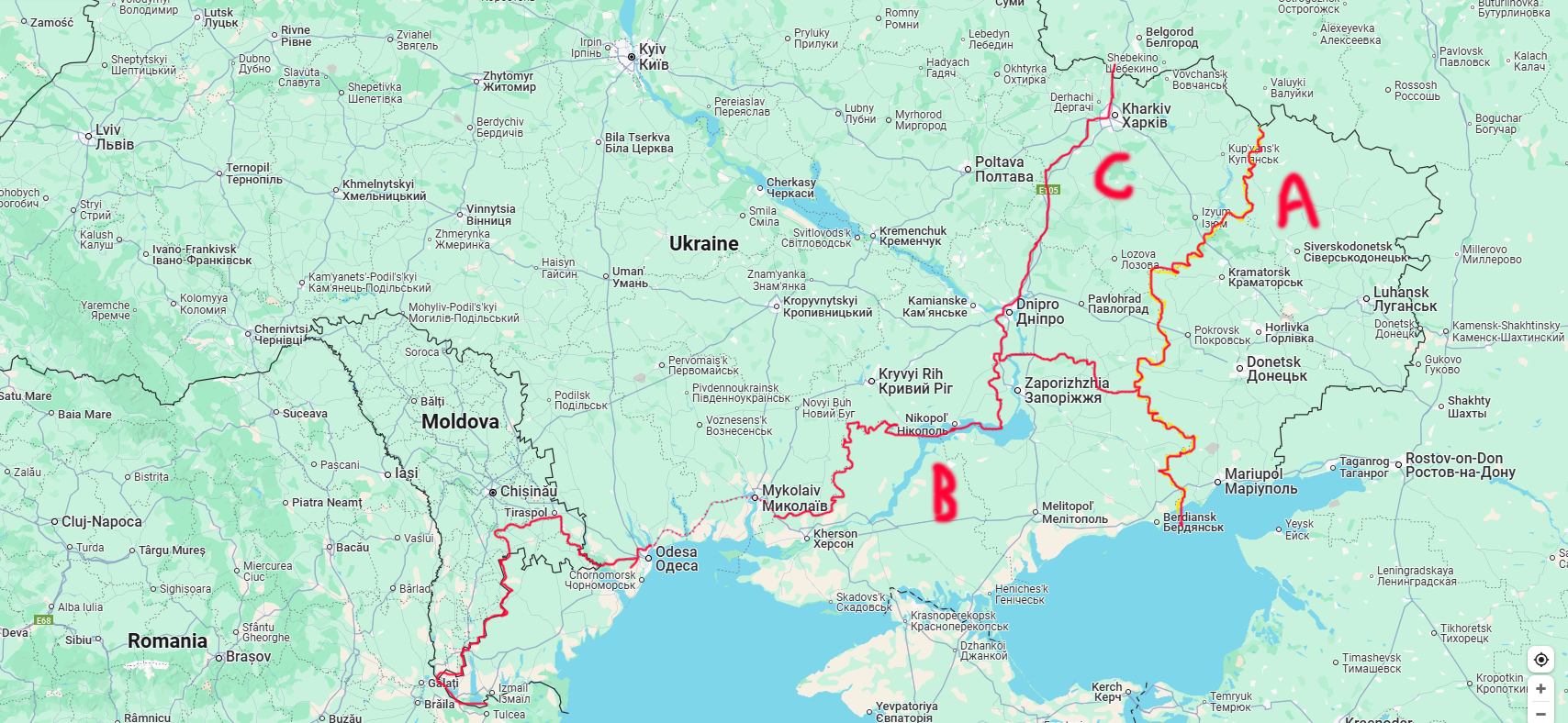 پلان C : برعلاوه مناطق شامل پلان بی، خارکیف، پلتاوا و دنیپرو به آن افزوده خواهد شد. زیرا ارتش اوکراین که در حالت از همپاشی قرار دارد، نمی تواند از خارکیف دفاع کند و روسیه می تواند با استعمال موشک "ورشنیک" مدافعین خارکیف را که آخرین دژ آزوف ها بعد از ماریوپول و باخموت است، درهم بکوبد. زیرا نازی زدایی یکی از مفاد مهم پلان راهبردی روسیه در اوکراین است. از طرفی هم خارکیف در نزدیکی شهر های بلگراد و کورسک روسیه است که در جنگ های بعدی از موقعیت آن بر ضد روسیه استفاده خواهد شد. در این مورد می تواند معامله شود و آزوف ها آنجا را ترک کنند و خارکیف شامل منطقه حایل غیر نظامی شود.