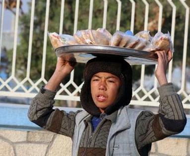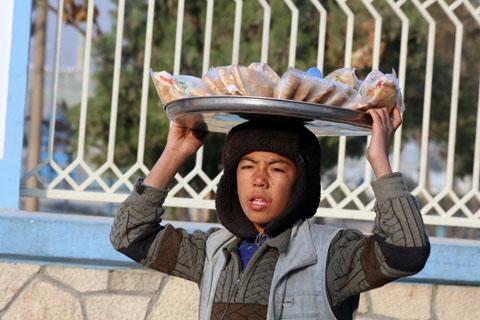 An Afghan boy in Mazar-e-Sharif supports his family by selling Samosas in the morning. He attends school in the afternoon.