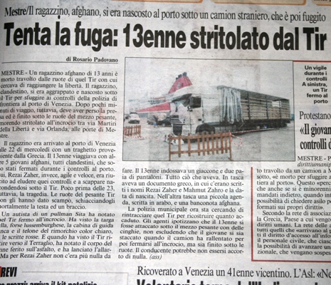 محمدظاهریک کودک 13 ساله افغانستانی که میخواست بطور قاچاق داخل ایتالیا شود توسط لاستیک های کامیون جان باخت. این اتفاق درخیابان اورلند شهرونیز چهارشنبه شب هفته گذشته حدود ساعت 10 شب بوقوع پیوسته است. تعداد انبوه ازمهاجرین افغانستانی که میخواهند وارد ایتالیا شوند مدت های زیادی به خاطر نداشتن پول درشهرپاترای کشور یونان مجبورند توقف نمایند تادرصورت امکان درکامیون های که عازم ایتالیا هستند خودرا جاسازی نموده وازاین طریق خودرا به ایتالیا برسانند. این مسافرت خطرناک که ممکن است 48 ساعت ادامه پیداکند برای این پناهجویان یک شانس حساب میشود زیرا آنها راه دیگری غیرازاین را ندارندبه گفته این پناهجویان اگرتوسط قاچاقبران بطور تضمینی بیایند مجبورند مبلغ 3000 یورو ازیونان تاایتالیا به آنها بپردازند.