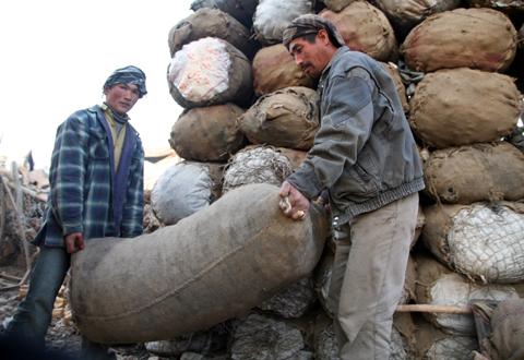قربان علی و برادرش بوجی های ذغال را برای فروش ذخيره می کنند