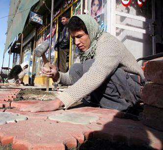 يو کارگر په کابل کښی د پياده رو تزئينی تيګی فرش کوی
