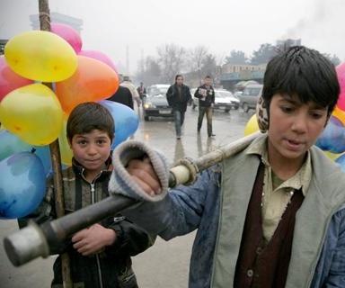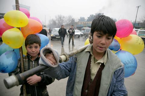 Brothers Munir and Basir selling balloons in downtown Kabul.