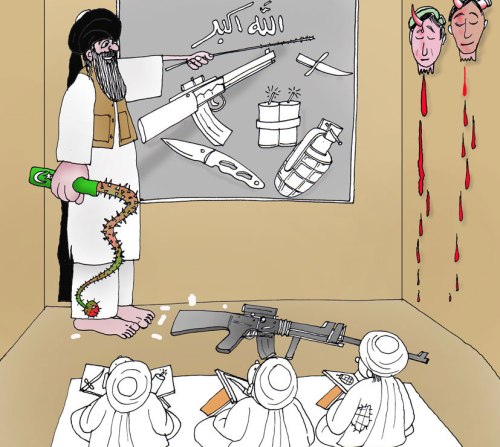 با عرض معذرت. بنظرم این اثر کارتون نیست. بیشتر یک نقاشی کودکانه است تا کارتون. این درست همانی را که میبینیم را میرساند.(طالبان خشونت می آموزند) پس این شد نقاشی. عکس هم زیاد ازین قاعده مستثنی نیست. اما کارتون اثریست که معنی اش در بُعد دگری نهفته. یعنی چیزی را که میبینی همانا معنی اش نیست. باید بیننده خود بدنبال معنی بگردد و نکته مهم و مختص کارتون هم همین است. لطفا کاری نکنید که بیشتر مورد تمسخر قرار بگیریم. البته من زیاد درین سایت نمیگردم. چون اینرا یک دوست ایرانی با تمسخر برایم گفت، نارحت شدم و مجبور شدم بیایم و ببینم. سعی کنید واقعا کارتون بکشید نه نقاشی. این برای خوبی خودتان است نه من. ما بحد کافی کمبود فرهنگی داریم. شما دیگر تاکیدش نکنید. سعی در اصلاحش باشید. اینرا دوستانه میگویم. من خوبی شما و کشورم را میخواهم جناب کارتونیست عزیز. امیدوارم که آزرده نشده باشید.
