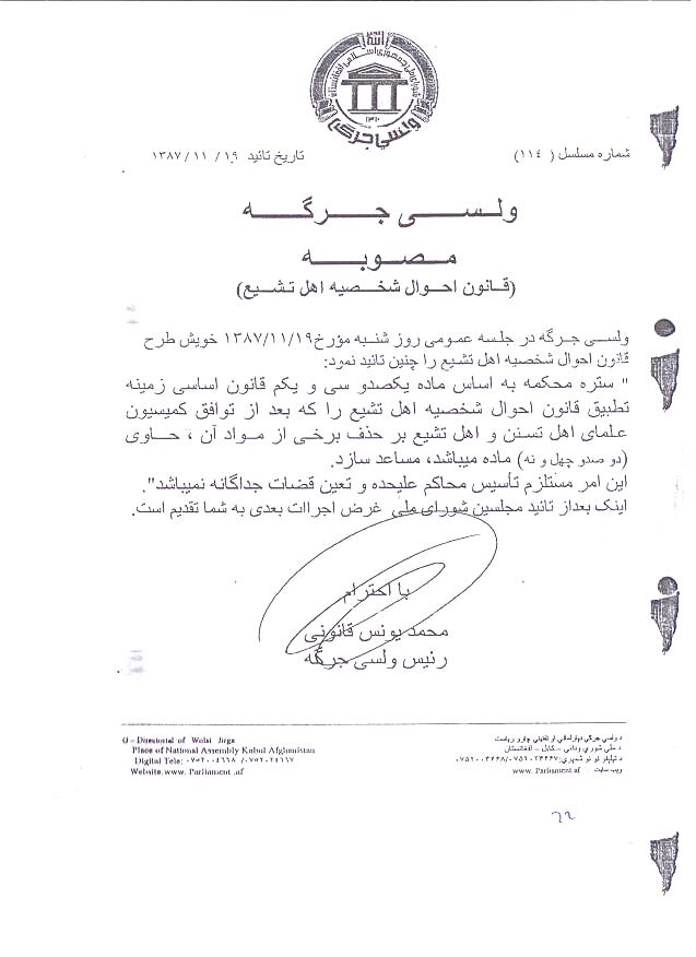 2- از اینکه آقای محسنی ، متهم به نقض حقوق بشر است و یک ناقض و متهم " هر چند شعادت های در مورد موجود است "هیچگاه نمیتواند قانون ساز باشد ، باید این قانون ملغاء ، و وزارت محترم عدلیه افغانستان، ترتبیب قانون جدید احوال شخصیه اهل تشیع را عهده دارشود.